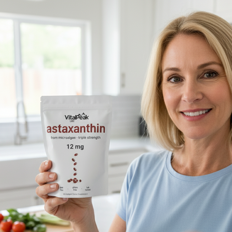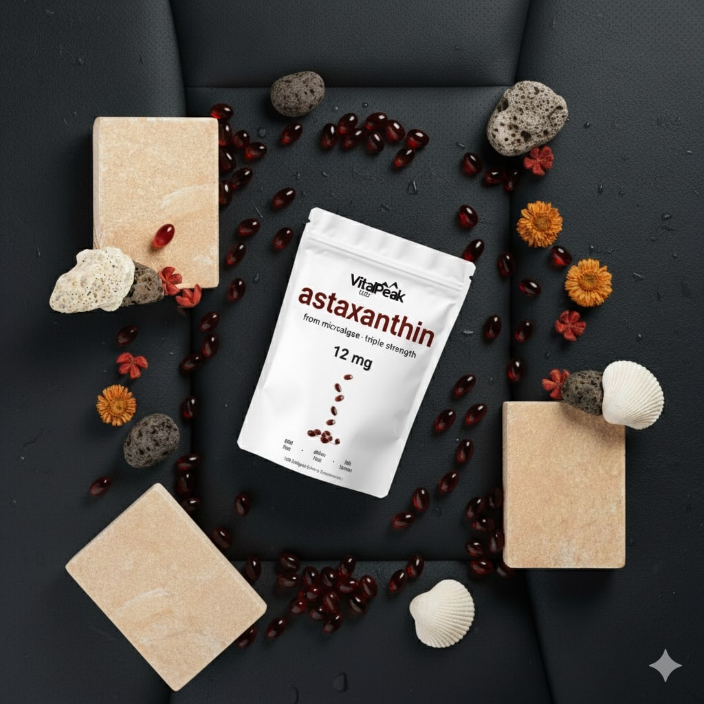 Astaxanthin is a powerful antioxidant derived from micro-algae. It helps protect your cells from oxidative stress, supports eye and joint health, and promotes overall vitality by neutralizing harmful free radicals in the body.