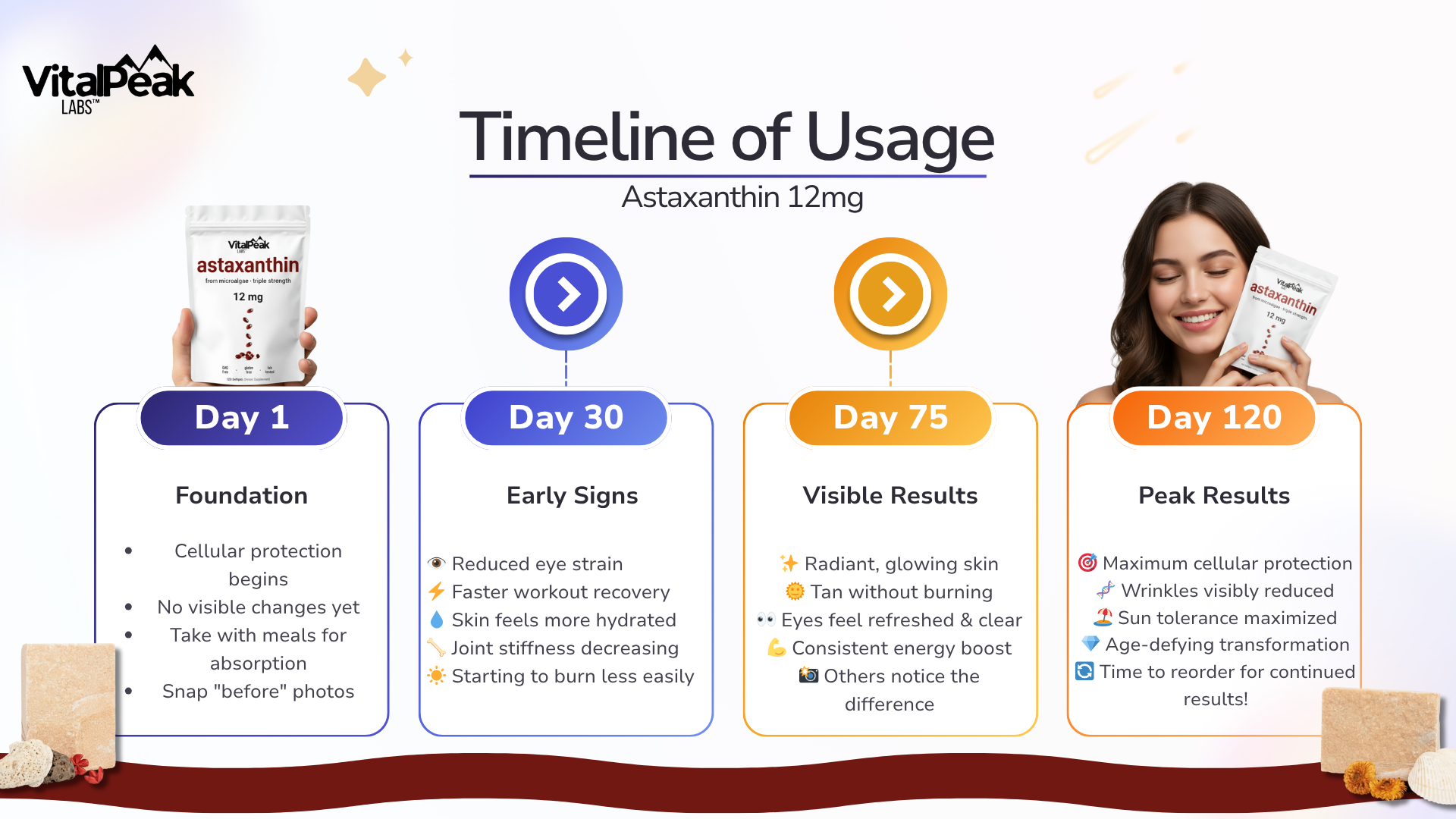 Results may vary. Expect to see changes within 30 days. Paired with a healthy lifestyle, the effects of Astaxanthin can increase.